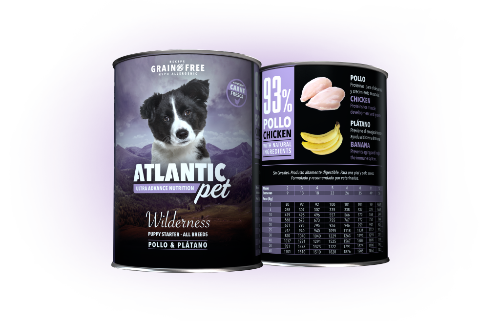 El alimento húmedo Wilderness Puppy de Atlantic Pet está formulado para cachorros, con 93% de pollo fresco y plátano para un crecimiento óptimo. Rico en proteínas y nutrientes esenciales, refuerza su desarrollo muscular y digestión.