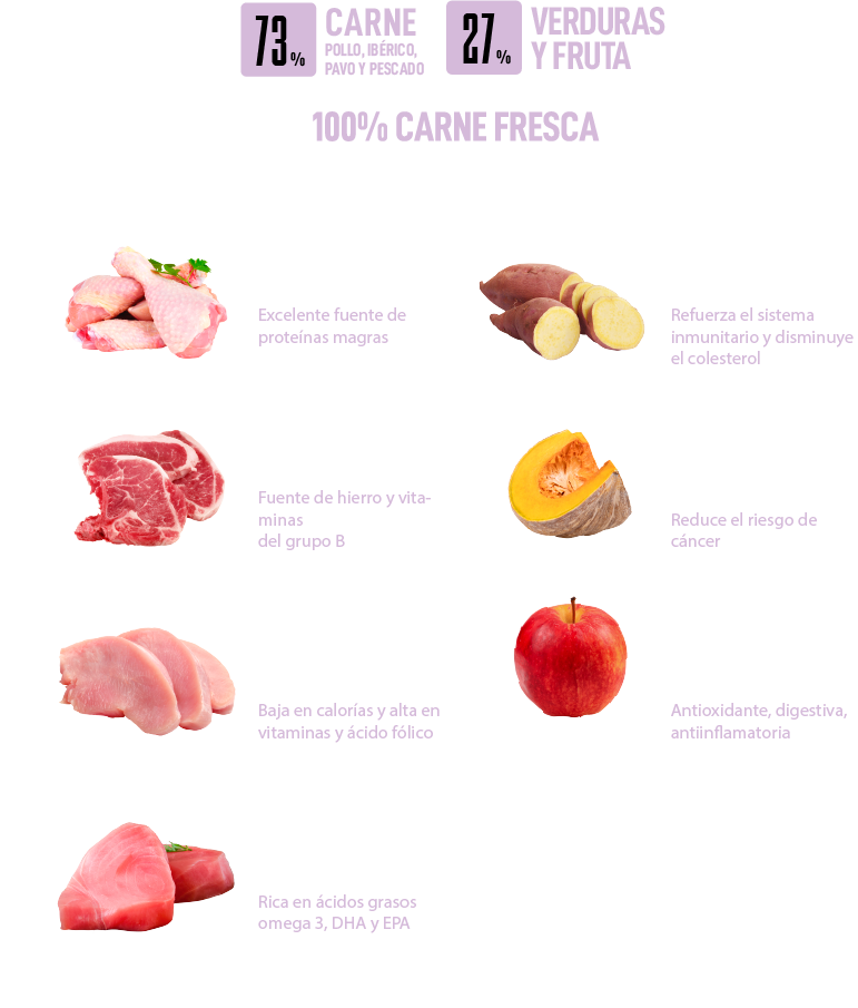 Contiene una alta proporción de carne fresca y deshidratada, sin harinas cárnicas ni aditivos artificiales.