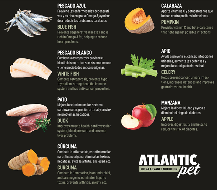 Cuidado del pelaje y la piel: El aceite de salmón y la grasa de ave (fuentes de ácidos grasos Omega 3 y 6) ayudan a mantener la piel hidratada y el pelaje brillante, mientras que el atún aporta sabor y proteínas marinas.