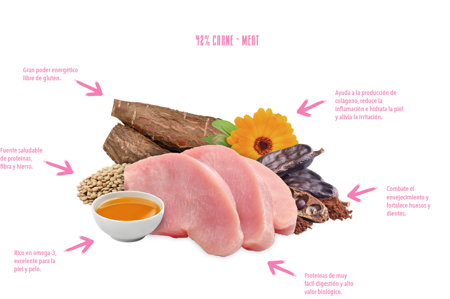 Carne 42% (pavo fresco deshuesado min. 6%, deshidratado min. 15%, pollo deshidratado)