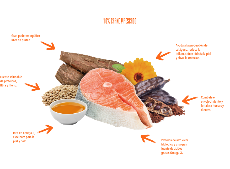Contiene una alta proporción de carne fresca y deshidratada, sin harinas cárnicas ni aditivos artificiales.