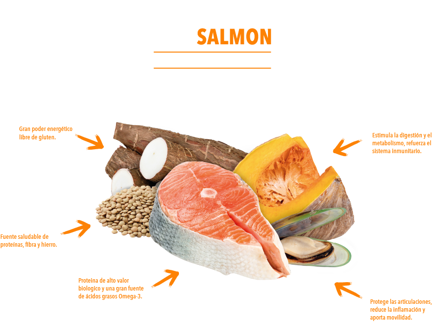 Contiene salmón fresco y deshidratado como fuentes principales de proteína de alta calidad.